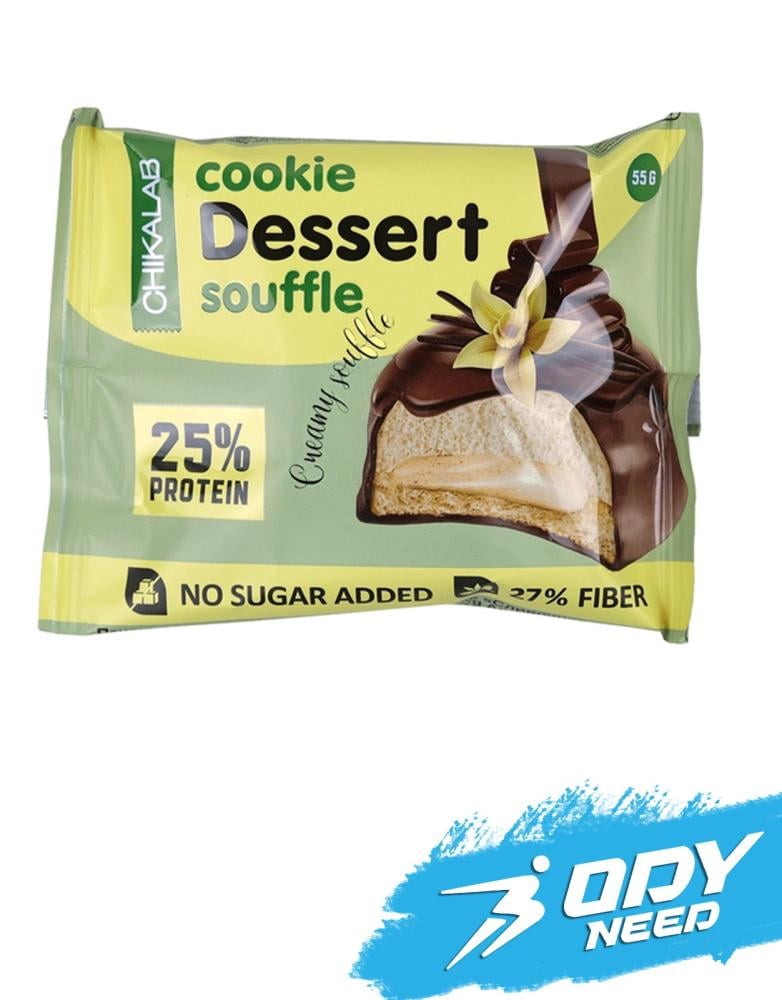 Chikalab Cookie Dessert Souffle ملفات تعريف الارتباط البروتينية المغطاة بالشوكولاتة مع سوفليه الرقيقة وحشوة الذواقة ستكمل نظامك الغذائي تمامًا وستكون وجبة خفيفة رائعة لأولئك الذين يهتمون بشخصيتهم. تحتوي كل حصة على 14 جرامًا من البروتين من بروتينات مصل اللبن والحليب. المحتوى المنخفض من الكربوهيدرات في ملفات تعريف الارتباط يجعلها إضافة سهلة لأي برنامج غذائي.