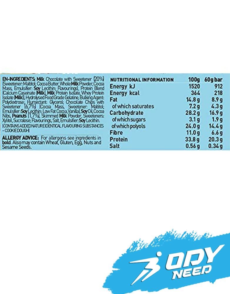 Protein Blend (Calcium Caseinate (Milk), Whey Protein Isolate (Milk), Milk Protein), Milk Chocolate with Sweetener (20%) (Sweetener: Maltitol; Cocoa Butter; Whole Milk Powder; Cocoa Mass; Emulsifier: Soy Lecithin; Natural Flavor), Bovine Collagen Hydrolysate, Sweeteners: Maltitol, Sucralose; Humectant: Glycerin; Bulking Agent: Polydextrose; Chocolate Chips with Sweetener (5.8%) (Cocoa Mass; Sweetener: Maltitol; Emulsifier: Soy Lecithin; Low Fat Cocoa Powder; Natural Flavor), Soy Protein, Soybean Oil, Sunflower Oil, Flavor, Potassium Chloride, Emulsifier: Soy Lecithin.